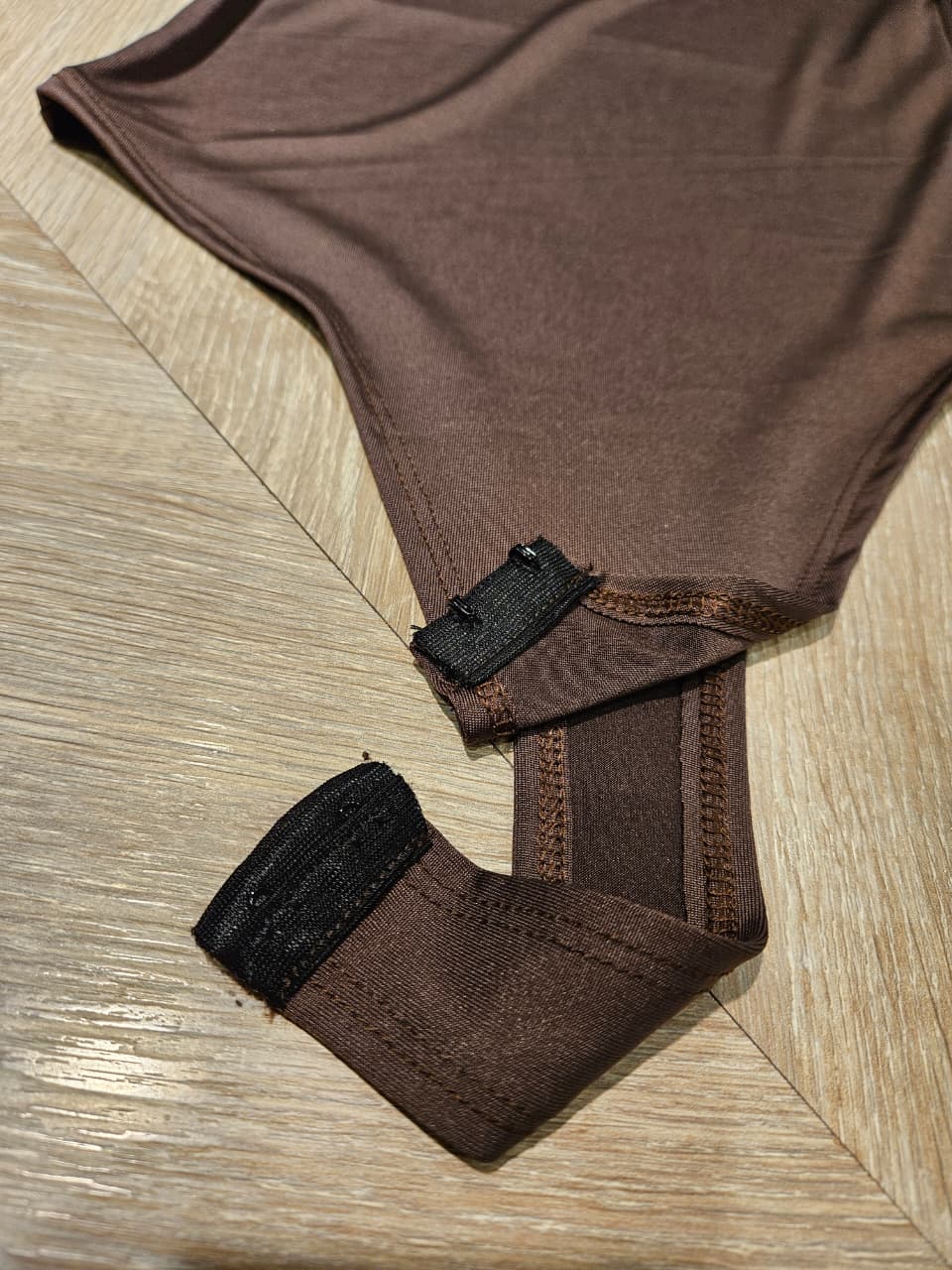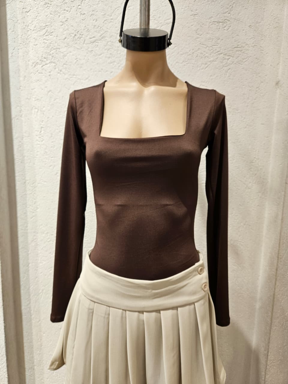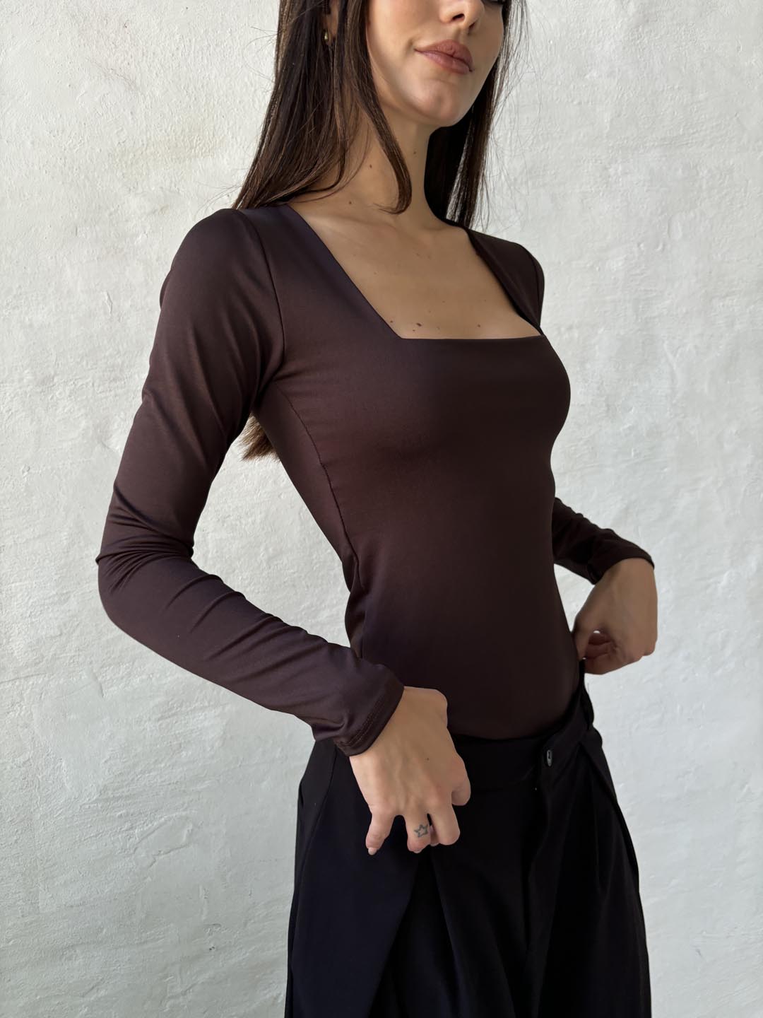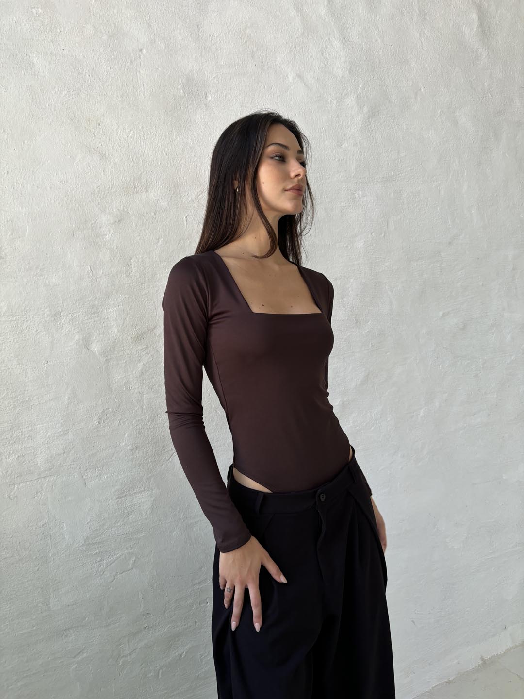 Body manga larga con escote recto y abrojo.