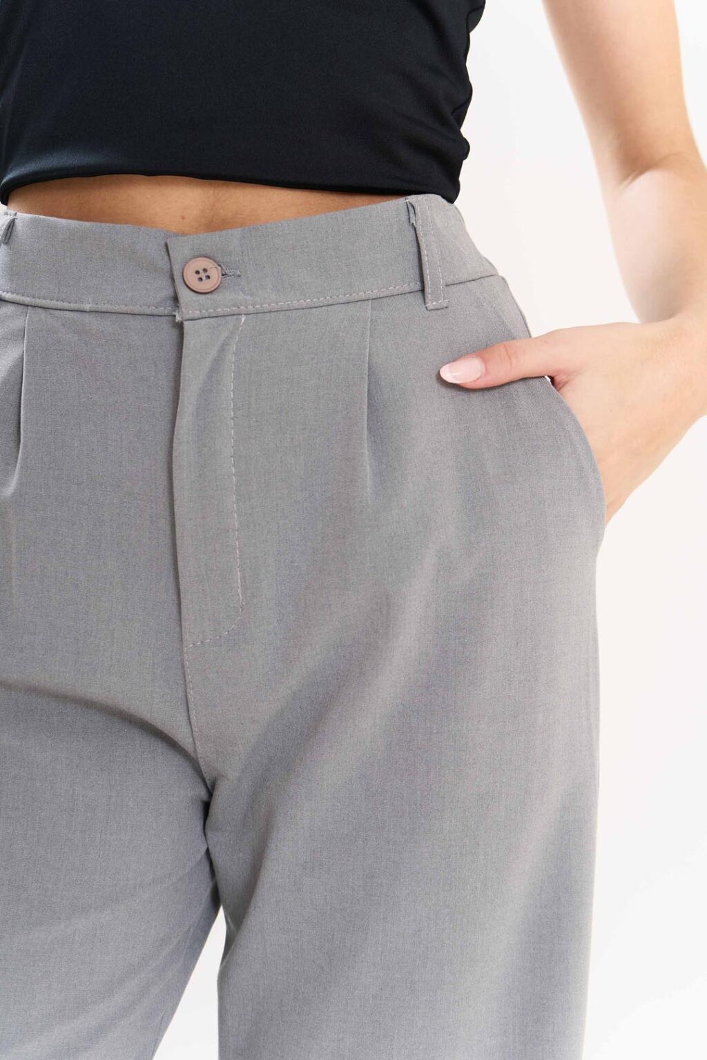 Botón, cierre, bolsillos delanteros, simil bolsillo trasero.