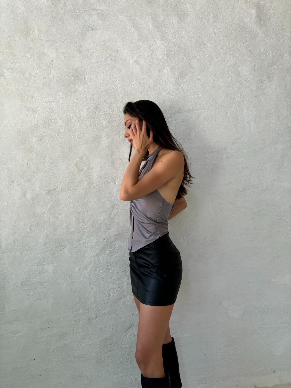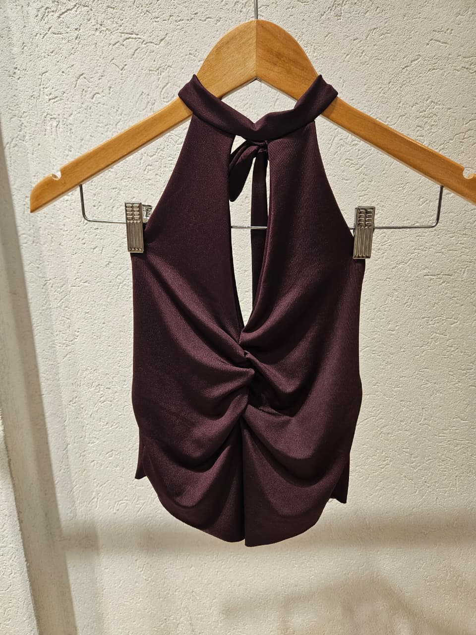 Top frunce frente, con abertura en el escote, picos y cuello choker con tiras para atar