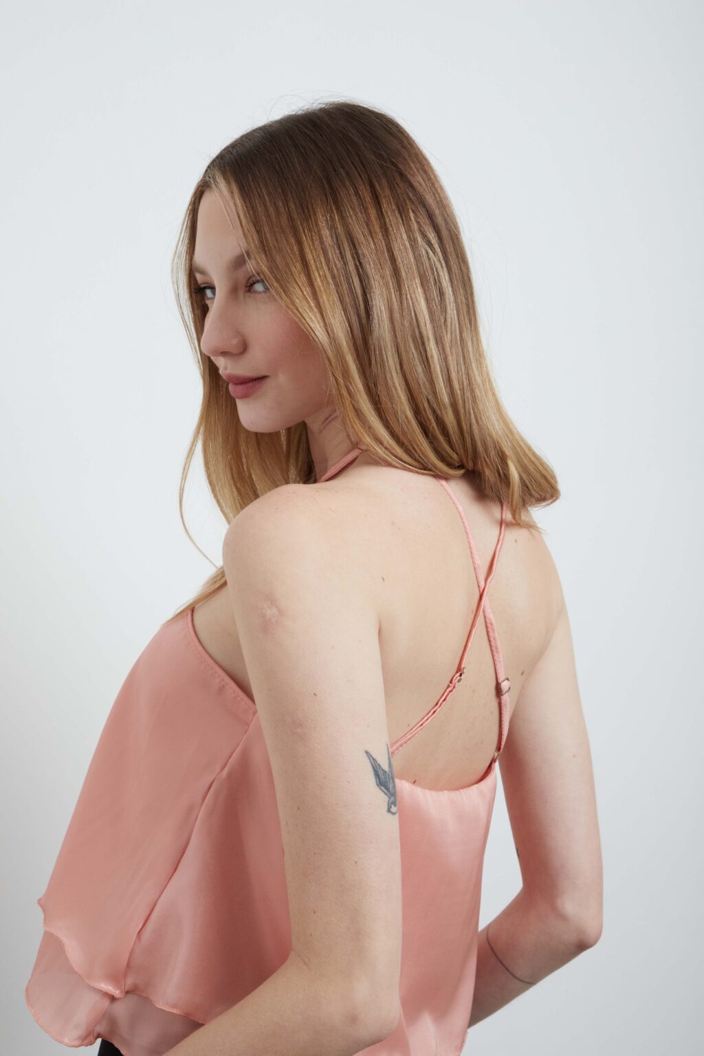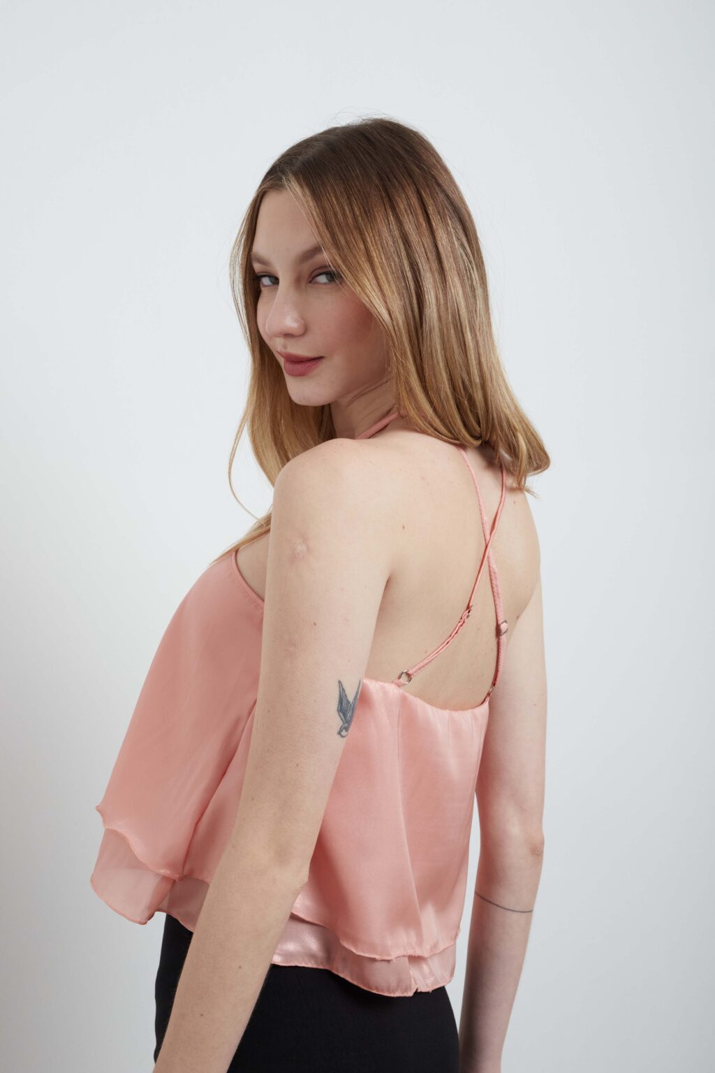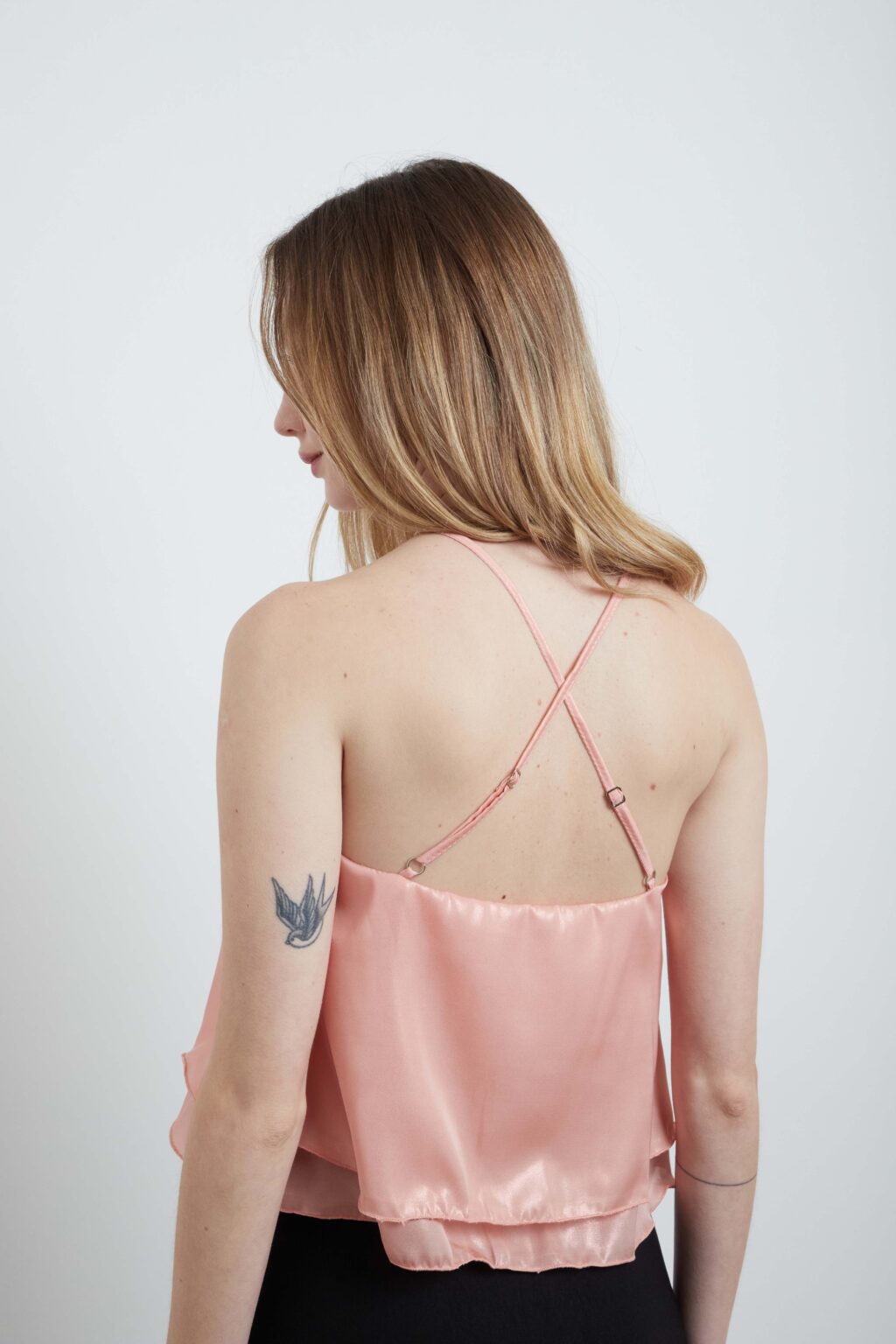 Detalle de gota en el escote, bretel que se cruza