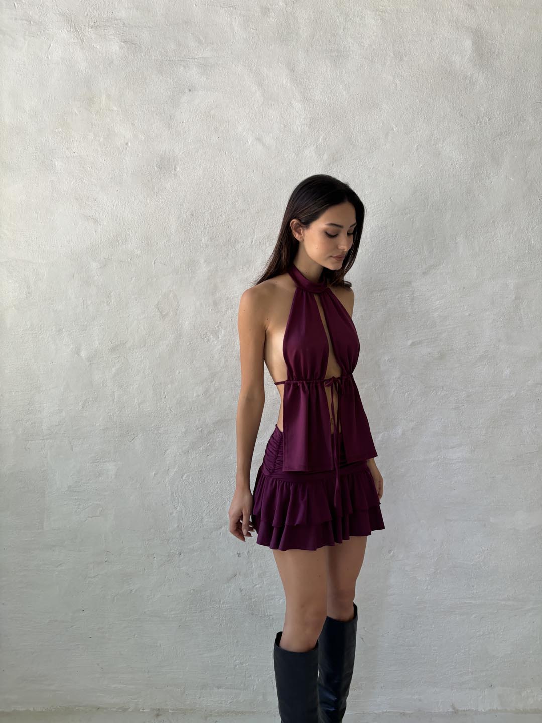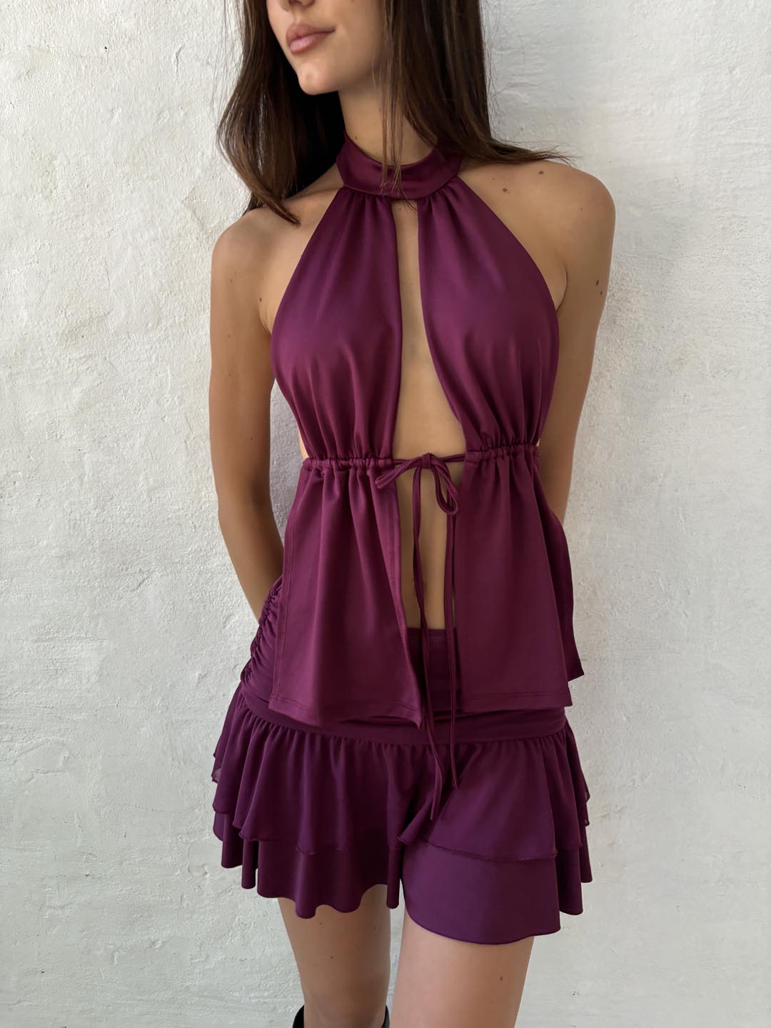 Top cuello chocker escote abierto, con tira para atar, frunce y espalda abierta