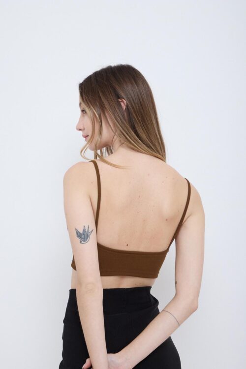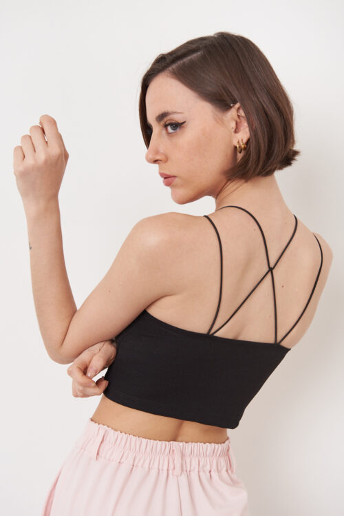 Top bretel fino, accesorio de mar, taza y elástico atrás.