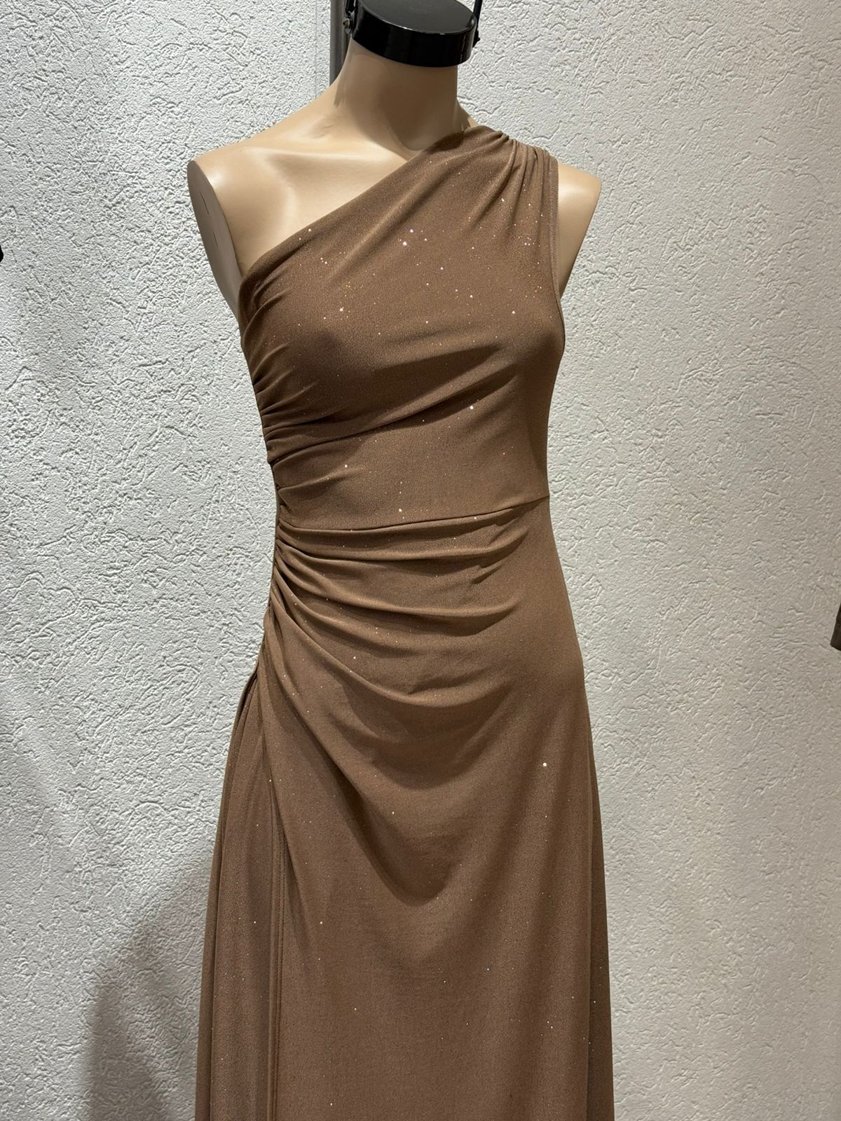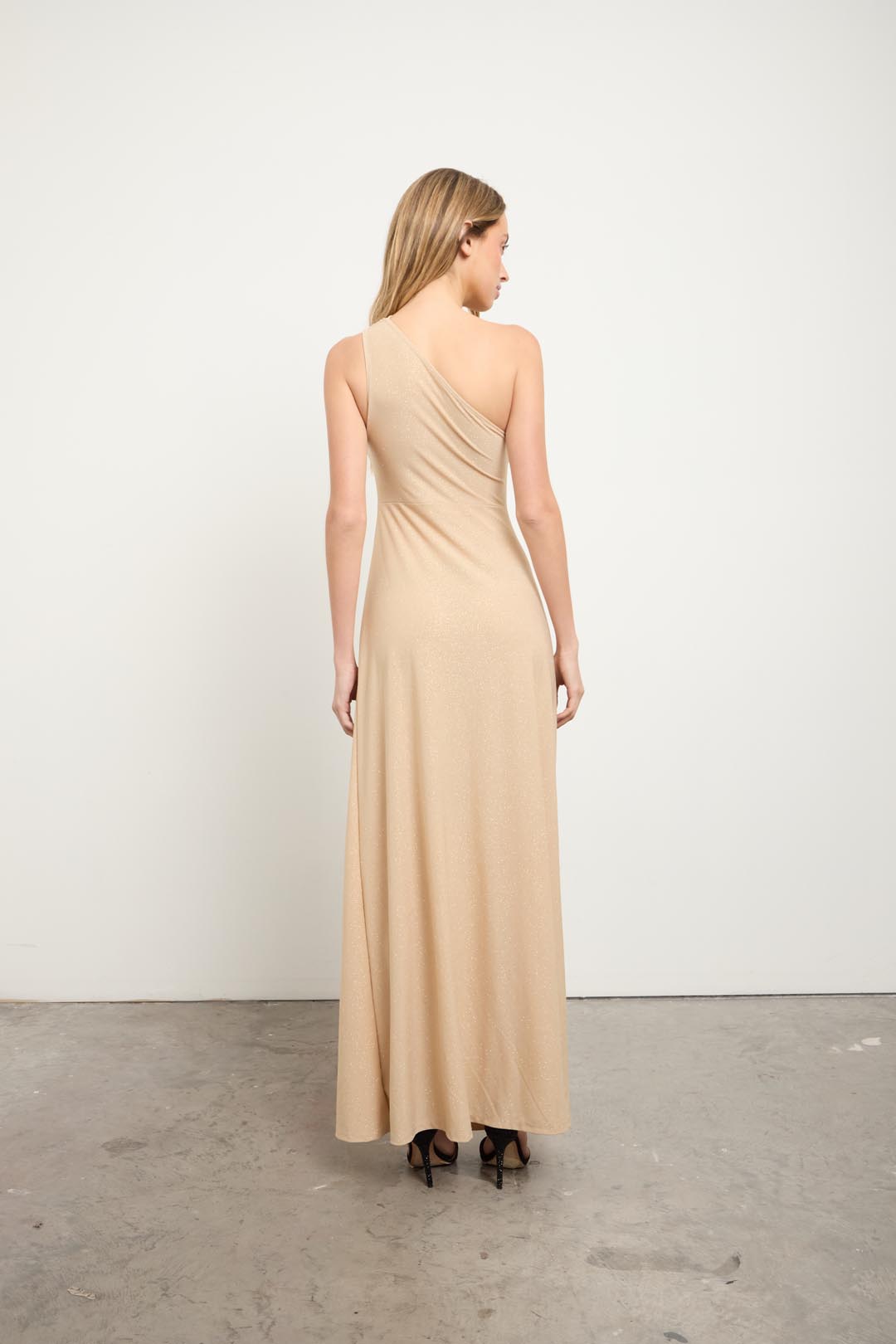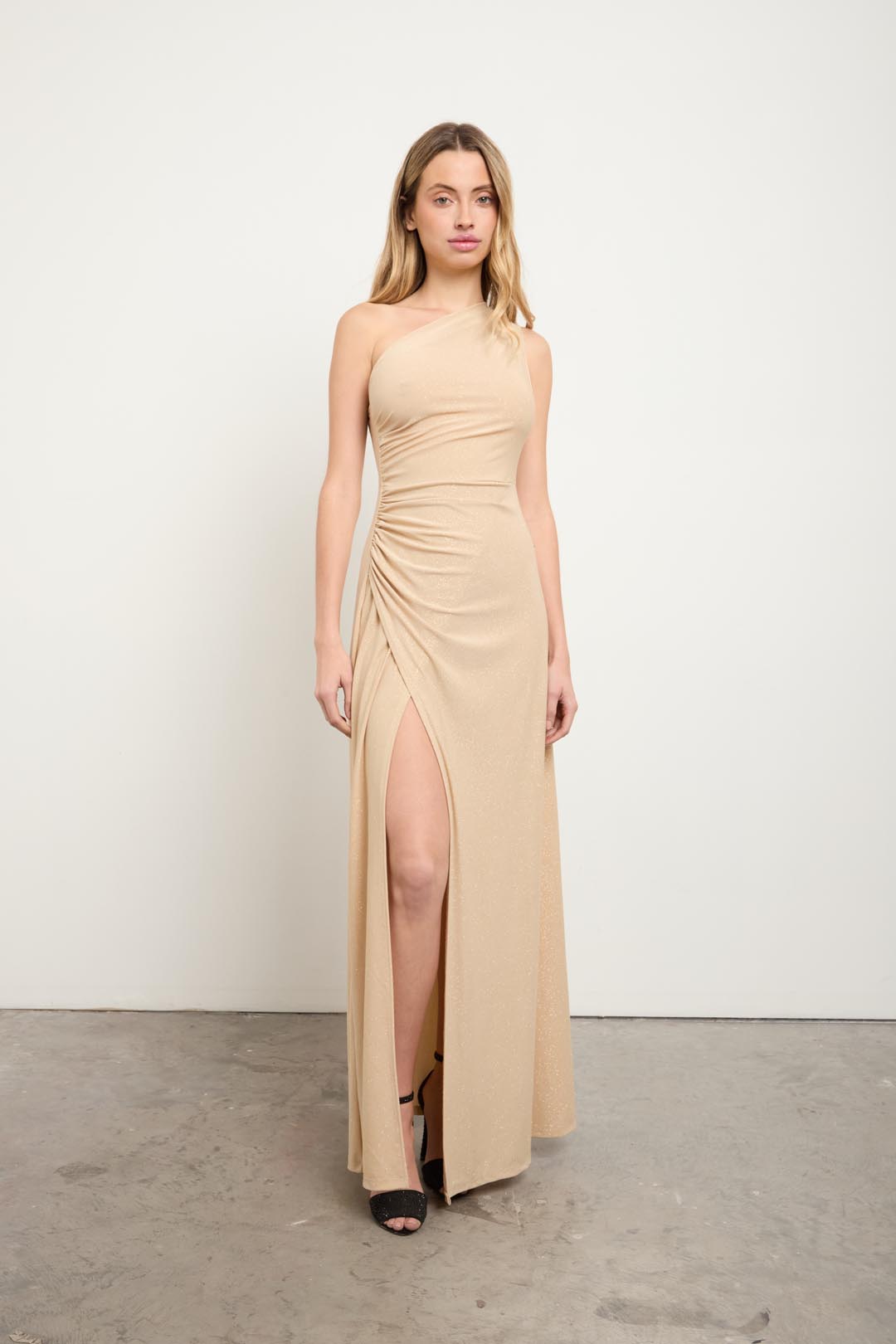 Vestido 1 hombro largo con frunce y tajo en el costado